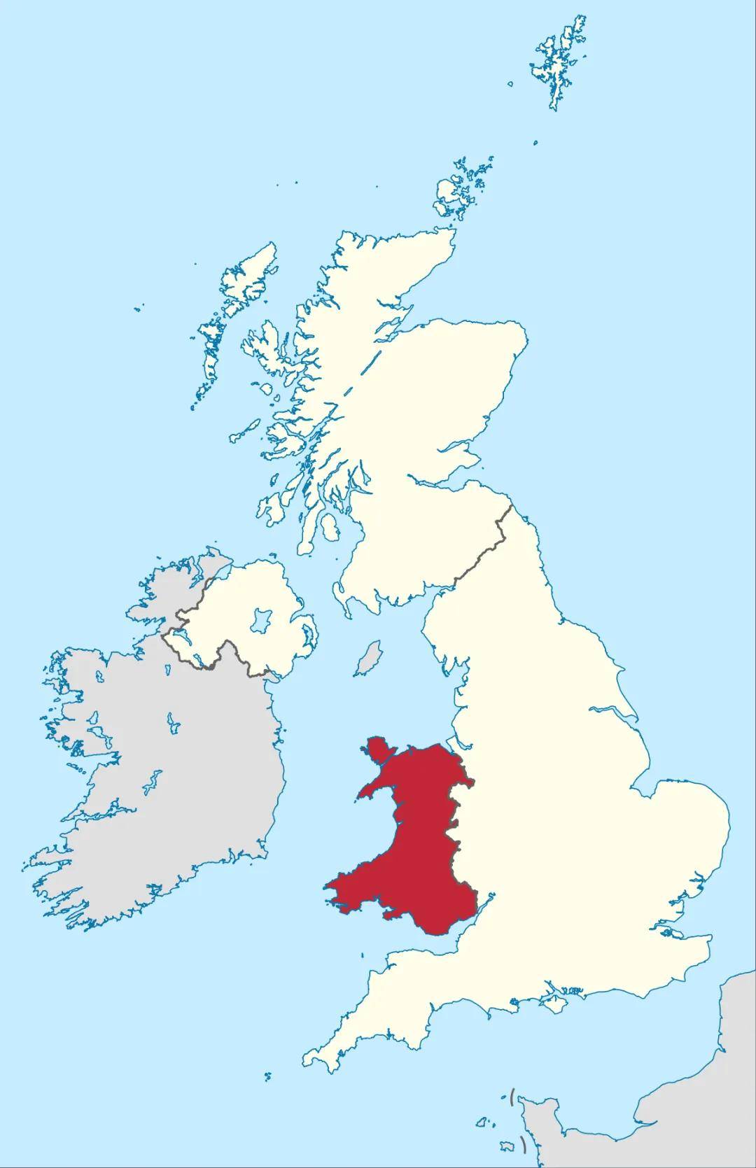 威尔士地处大不列颠岛西南部,三面环海,西临圣乔治海峡与卡迪根湾,南滨布里斯托尔湾,北濒爱尔兰海,面积约2.08万平方千米。