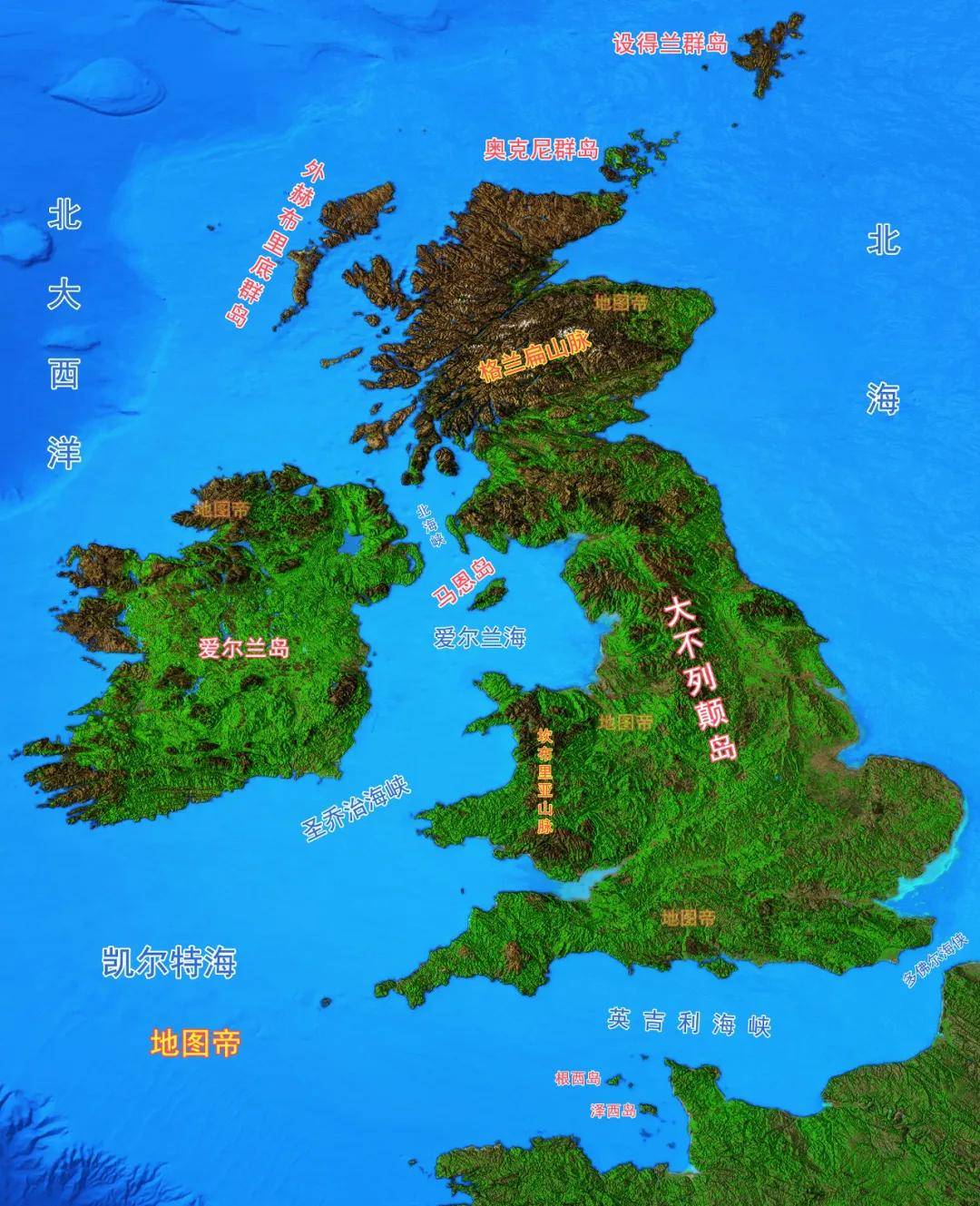 威尔士多山,坎布里亚山又称坎布连山,呈东西走向,平均海拔400-500米。北段多火成岩,有过冰川作用,故地势崎岖,多山峰,最高峰斯诺登山,海拔1085米。