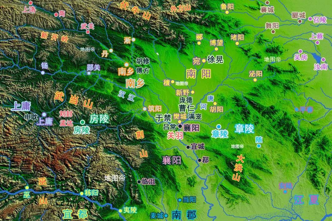 三国时,曹操控制南阳盆地,诸葛亮的战略是:“将益州兵以向秦川,将荆州兵以向宛(南阳)、洛(洛阳)”。关羽在襄阳擒于禁、斩庞德,水淹七军,威震华夏。