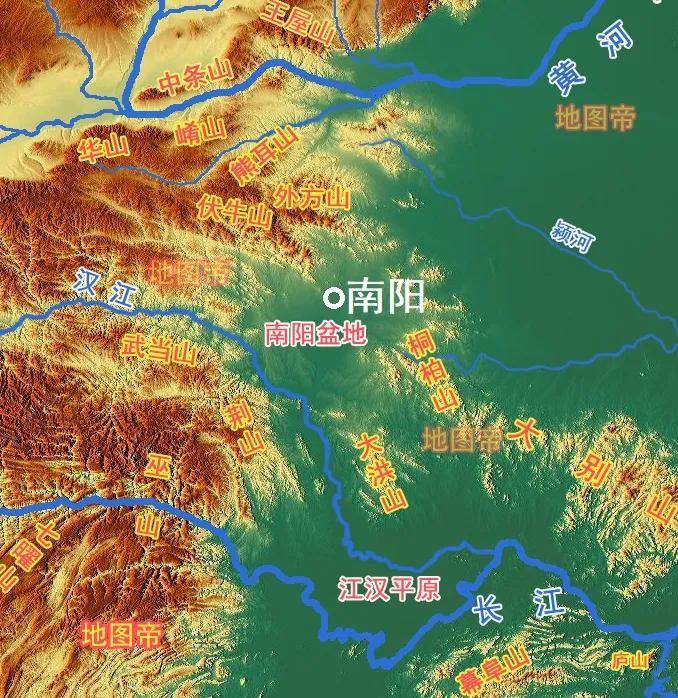 南阳盆地三面环山,南部开口,大致是秦岭西部的伏牛山、外方山、方城山、桐柏山、大洪山、荆山、武当山围成的区域,由汉水支流丹江、唐河、白河等河流冲积形成。