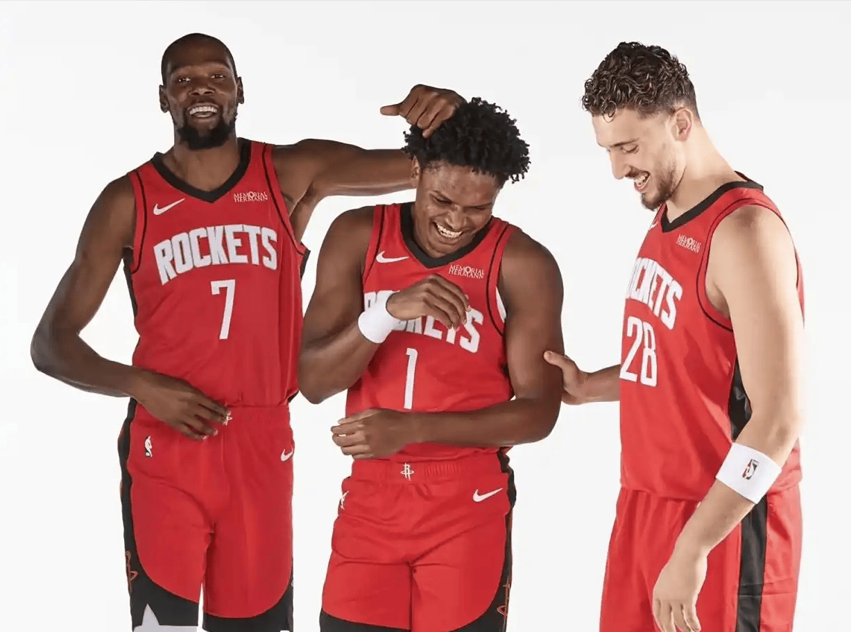 火箭媒体日的定妆照里,阿门・汤普森站在最中间,杜兰特和申京分在两边,这事儿让不少人意外,论实力和地位,本该是杜兰特站C位,但站位其实是杜兰特主动让出来的,他根本不用靠站位证明自己是核心。