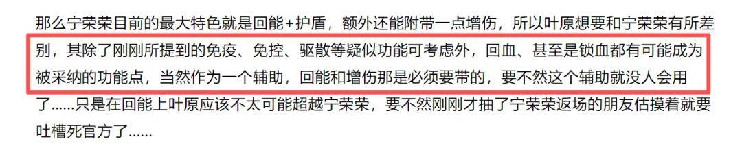 那么从当前版本的其他辅助魂师特色和叶原差异性特色结合思考,外加叶原作为通行证魂师那并不算高的获取门槛,她还真就很有机会成为仅次于宁荣荣的版本辅助第二人,毕竟现在除了宁荣荣外,奥斯卡因为太难抽到而导致保有率极低;鬼魅一则需要超高练度支撑二则更倾向于长图及特定队伍,泛用性不是很足;白玉鼎则有点一言难尽,练度不高时可能还没宁风致好用;接着宁风致怎么说也只是一个SR武魂,上限着实有限;最后的绛珠就更不用提了,所以大家又认为叶原能达到怎样的高度呢?这里也欢迎朋友们留言来聊聊自己的看法吧!