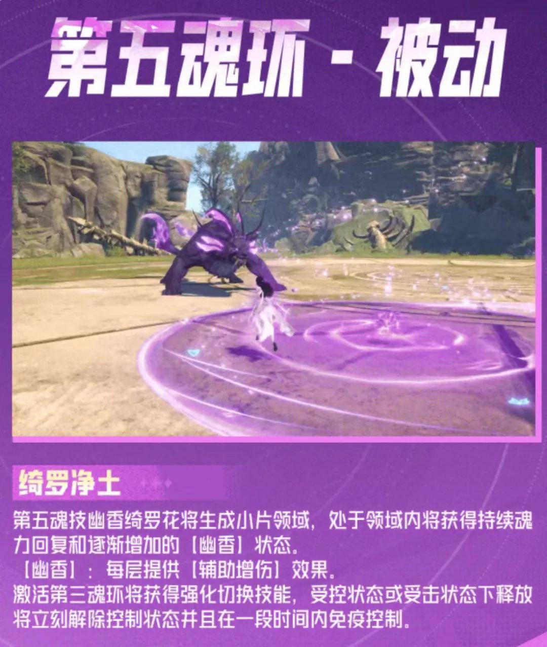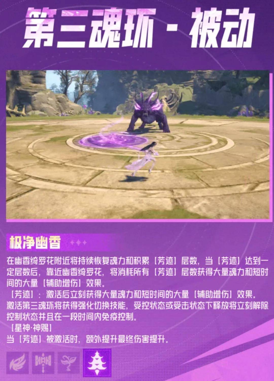 而在这个技能下边官方还补充了其可以直接免控和驱散控制,这两点在PVP中属于潜力神技,如果这个免控的时间可以达到5秒左右......叶原甚至还有机会去竞争最强PVP辅助,最后官方也公布了叶原的神赐魂环效果,激活芳迹时可以额外获得最终伤害的提升,估计数值会在10%上下。
