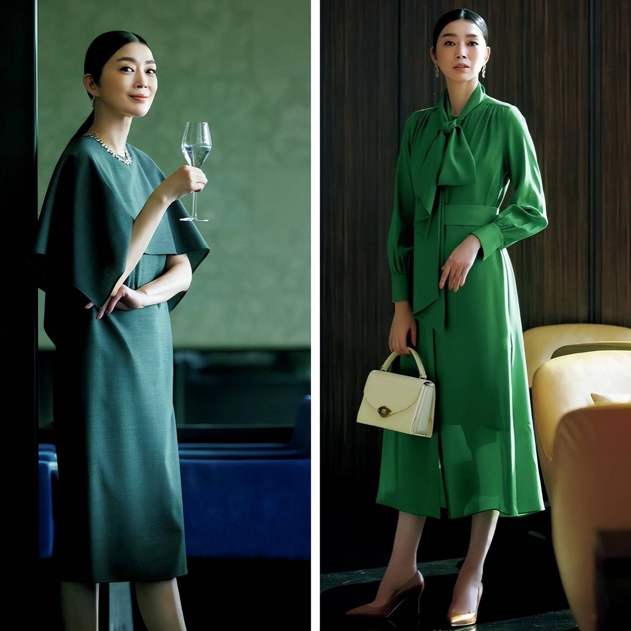 这款丝绸连衣裙以微妙光泽和柔软垂悬展现活力绿色和长弓形设计,适合大型场所,并可通过佩戴或不佩戴皮带灵活改变风格。