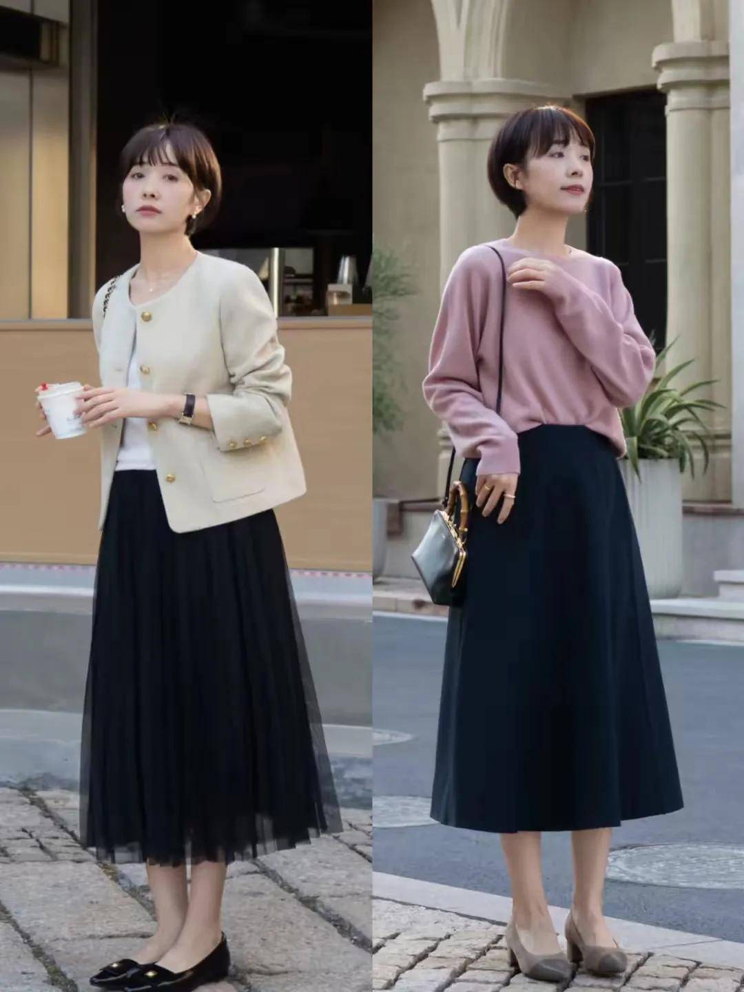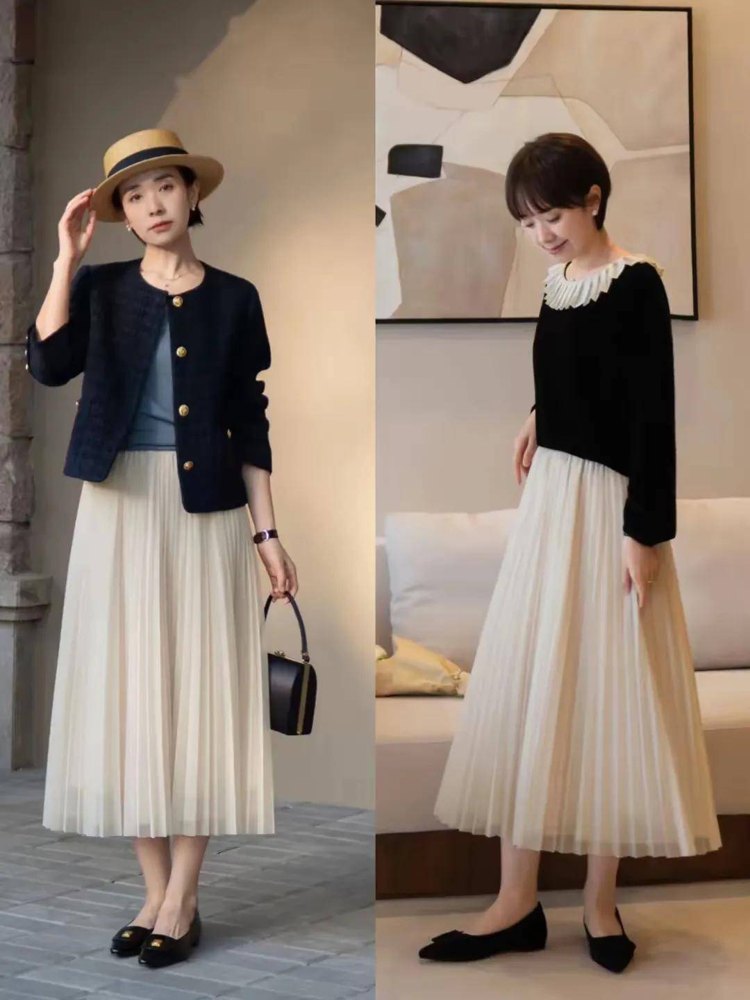 如果你是小个子女生,这时候年龄在三四十岁左右,我们应该要想办法去提升腰线,使得自己的身材比例形成三七分,比如我们可以用上短下长的搭配短款的小香风外套,搭配上杏色的百褶半身裙,这样也能使得穿搭者显高显瘦。