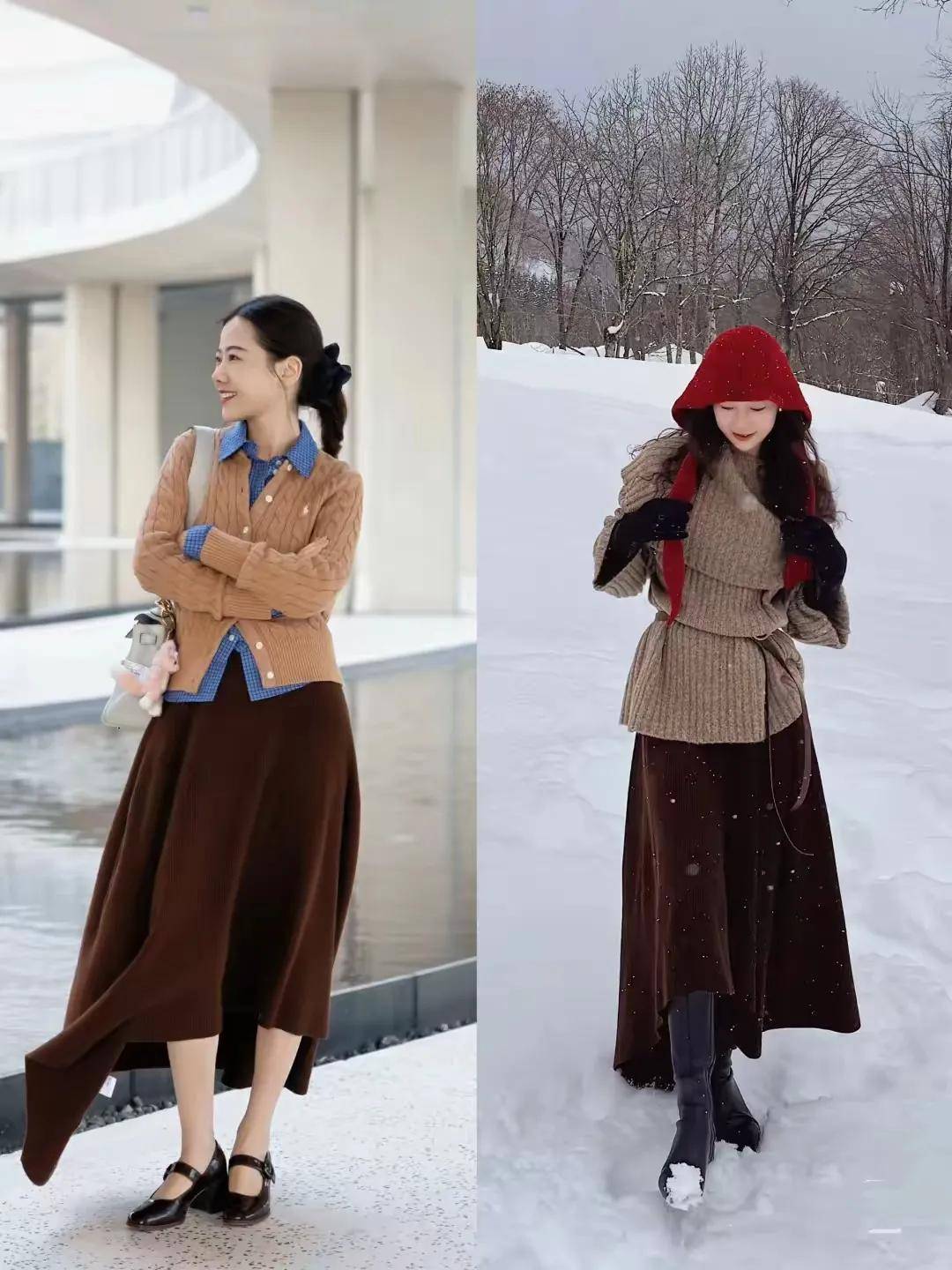 我们选择针织开衫毛衣的时候,也可以选择羊毛材质,羊毛材质不容忽视,经纺羊毛面料细腻光滑,具有一定的挺括感制成,像下面这两位达人穿的毛衣服饰的线条简洁利落,搭配上棕色的散装半身裙后,显得大方得体,这样的穿衣打扮非常适合北方城市的女性穿搭。