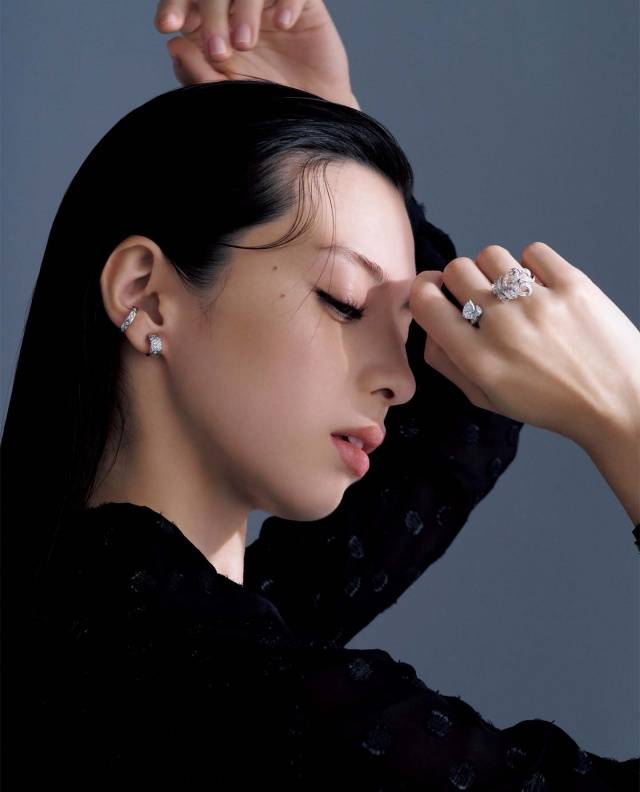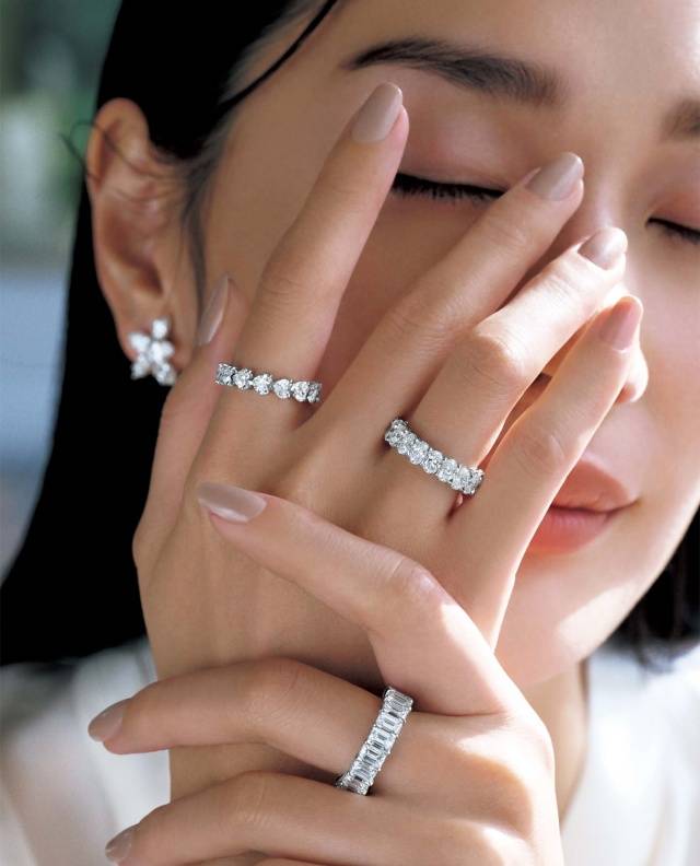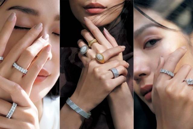 将可爱的心形与冷峻、利落的祖母绿切割相结合,可以打造出层次丰富、充满深度的视觉效果。可以将不同造型的戒指佩戴在不同的手指上,突出各自的独特美感,也可以通过叠戴的方式,营造微妙的时尚层次感。