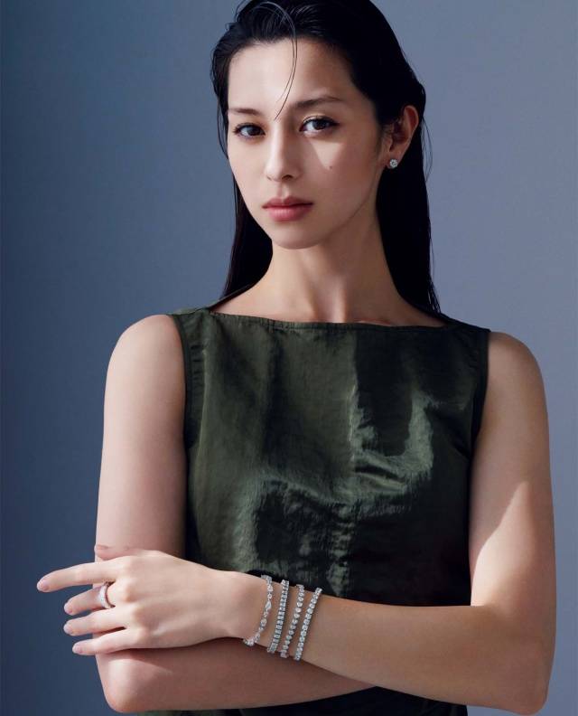身着无袖深绿色服装富有光泽,呈现出优雅的质感。戴着一枚戒指,手腕上叠戴有多条闪亮的手链,手链设计精致,镶嵌有钻石或类似的璀璨元素,增添了整体造型的华丽感。耳朵上佩戴着小巧的耳钉,与腕间的饰品相呼应,细节之处尽显精致。