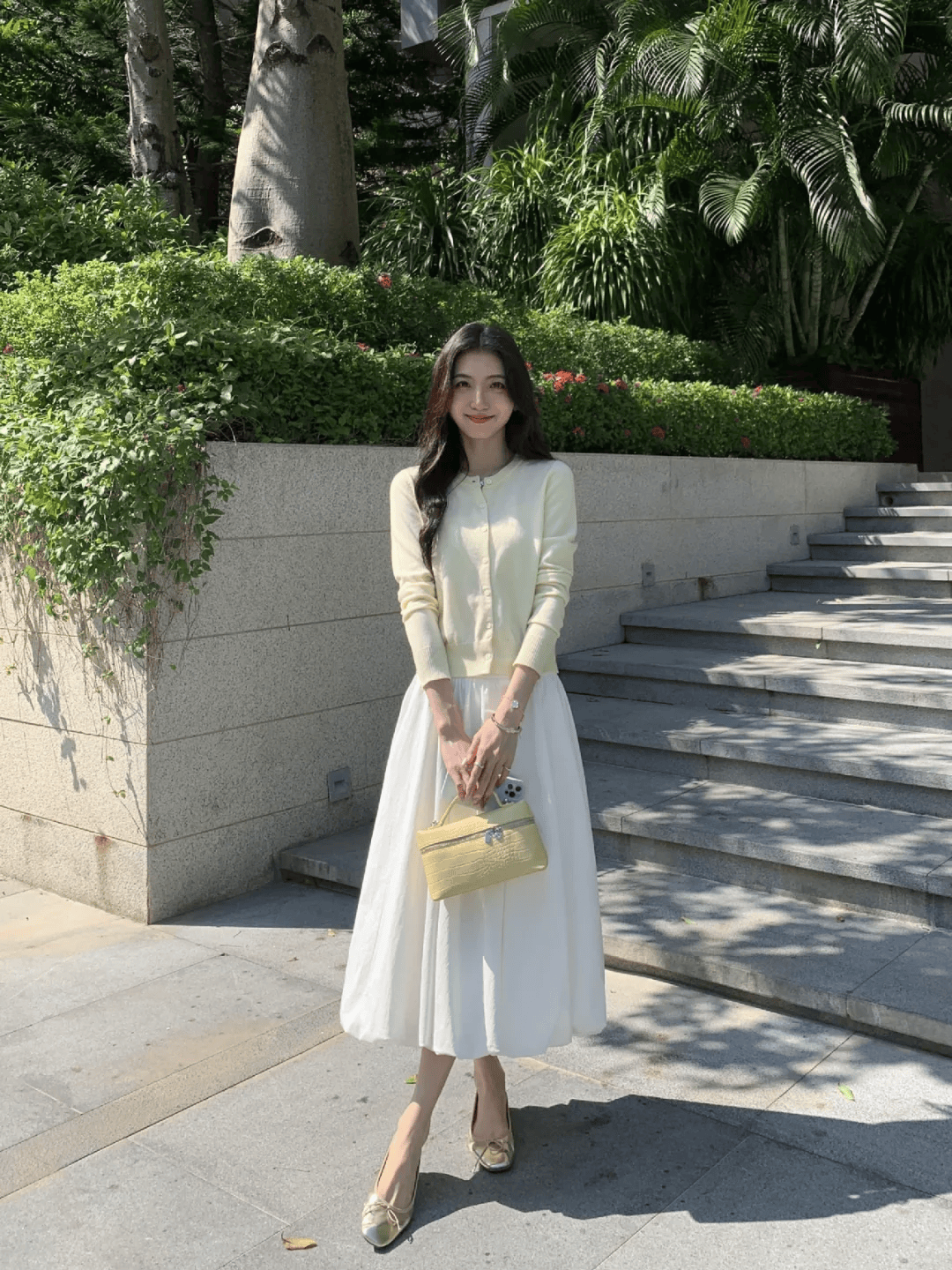 针织衫与半身裙的搭配,是日常生活中最常见的组合之一。黄色的针织衫,以其明媚活泼的色彩,为整体造型注入了元气与活力。搭配一条色彩平淡朴素的半身裙,既不会让整体配色过于凌乱,又能突出重点,展现出简约而不失时尚的美感。