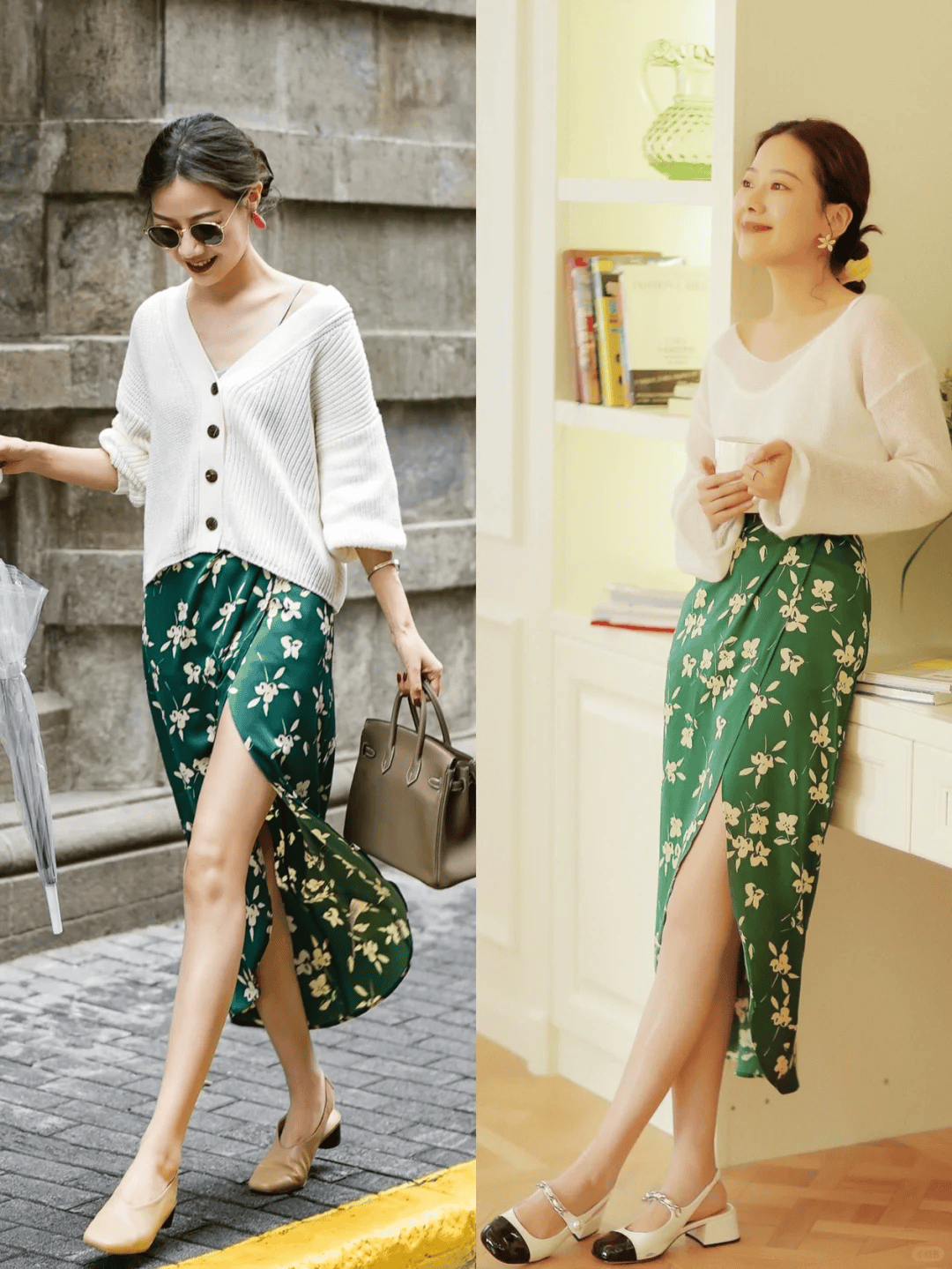 绿色的印花半身裙,开叉的设计让女性的双腿在行走间若隐若现,宛如一幅美丽的画卷,十分养眼。