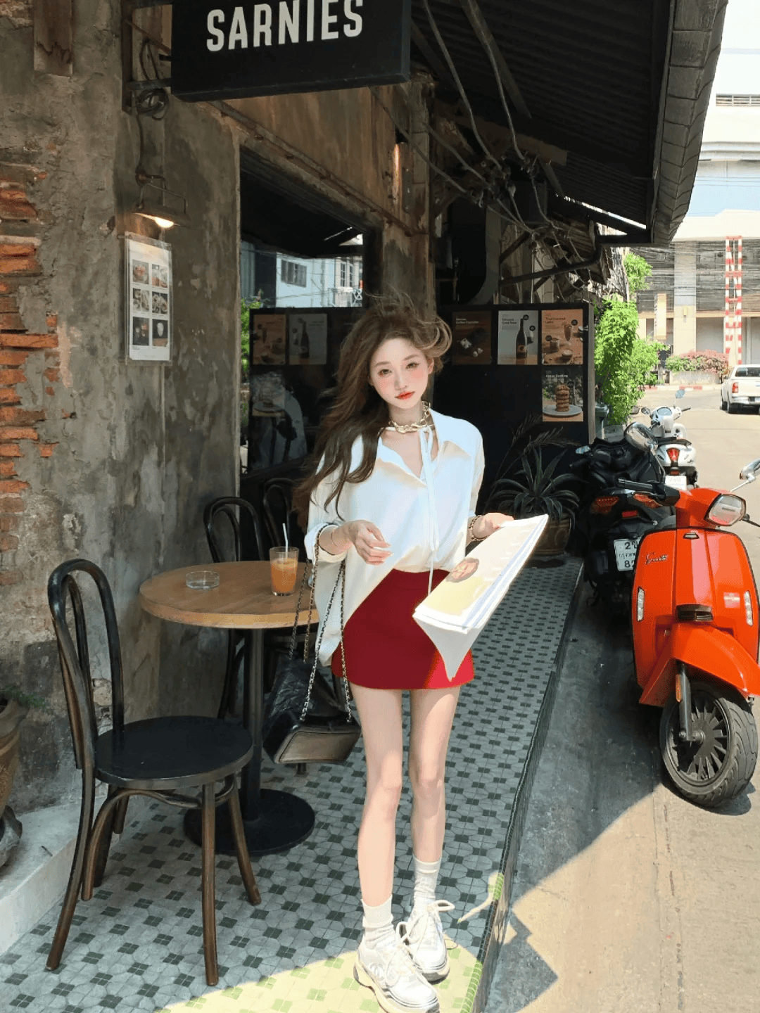 搭配一条红色的高腰包臀半身裙,将女性的婀娜身姿展现得淋漓尽致。衬衫的百搭性还体现在它可以与各种单品进行组合,打造出不同的风格。