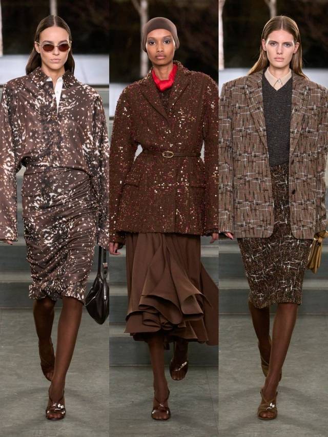 秋冬时尚强调女士般的优雅与放松,同时离不开高品质质感。缎面和天鹅绒的低调光泽提升穿着的尊贵感,而针织套装和连衣裙则散发出宁静而奢华的气息。