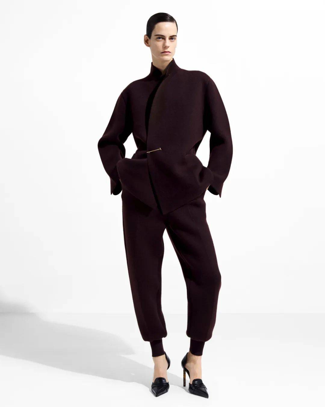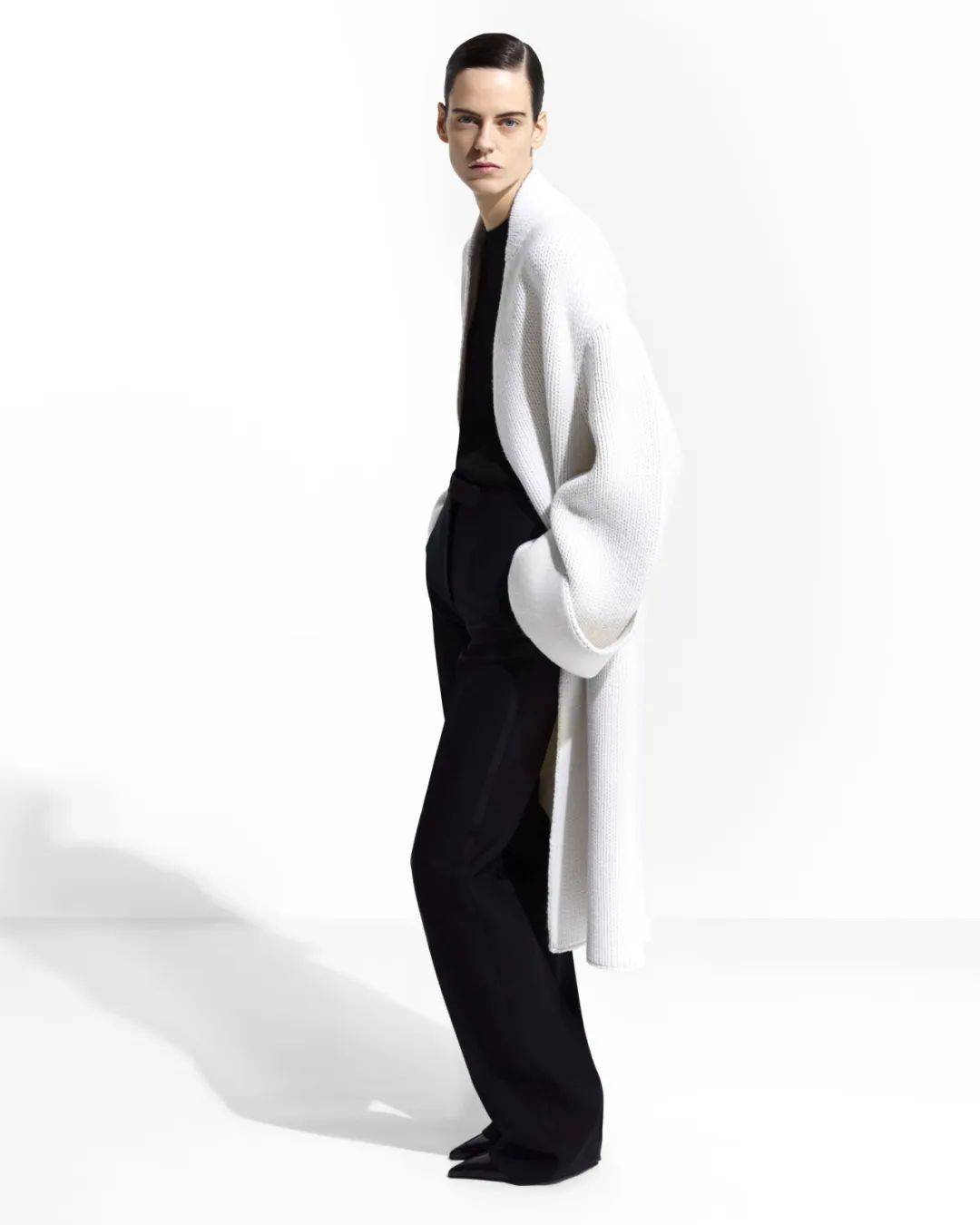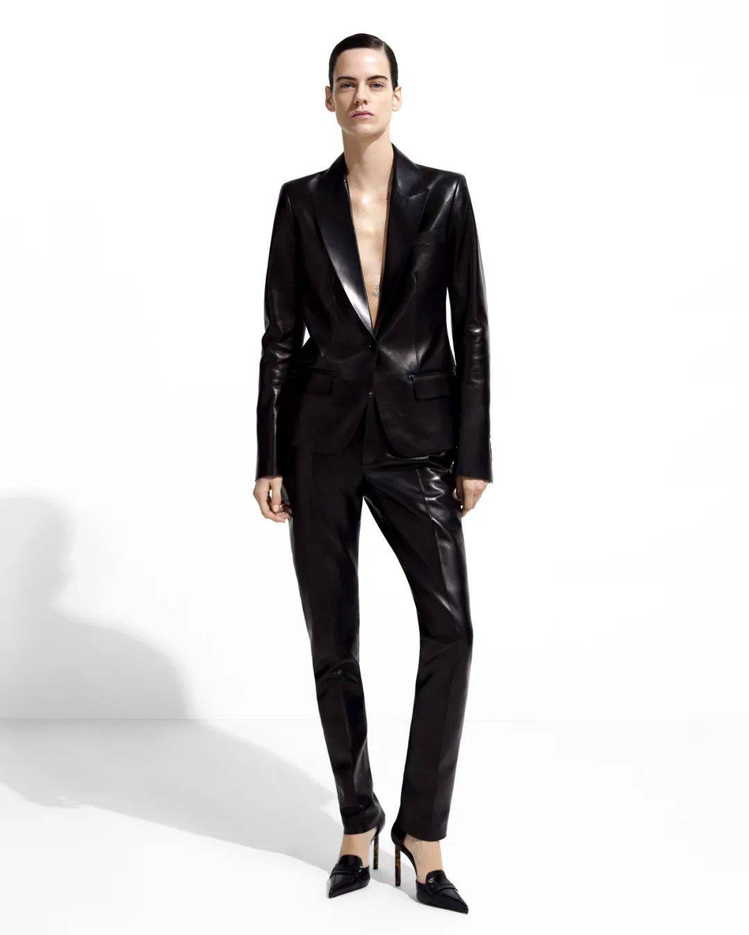其中,女装叙事由TOM FORD无尾礼服开启。丝马海毛混纺面料以斜纹织法雕琢精准比例;哑光黑单排扣戗驳领夹克以重磅肩线、微弧袖管与罗缎领面塑造力量感,搭配极窄锥形长裤,完成经典符号的当代转译。