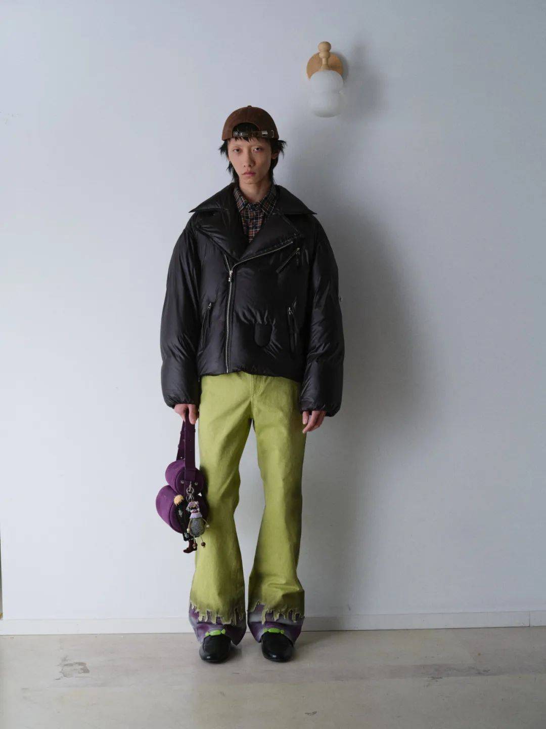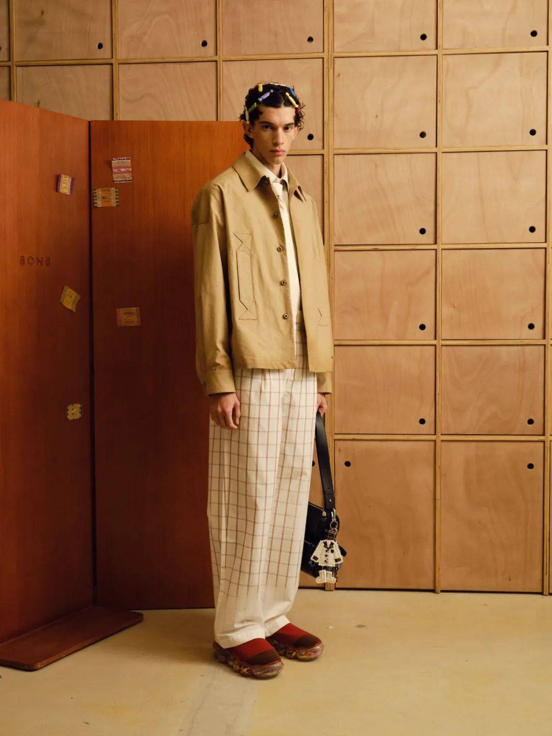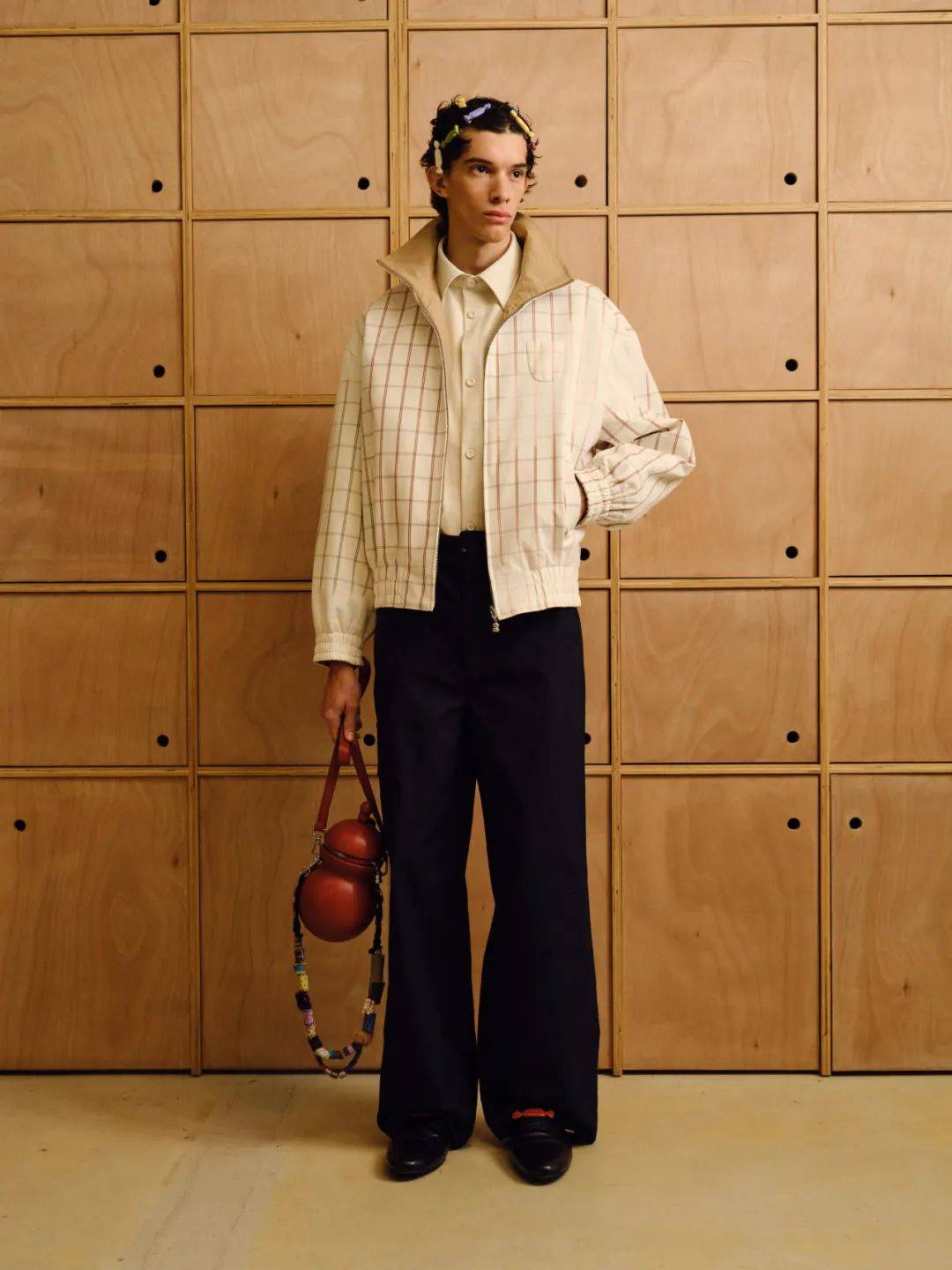 男装以双排扣戗驳领西装开启华章。经典机车夹克以oversize廓形重塑,内衬同色剪羊毛彰显质感,与1950年代复古牛仔裤相得益彰;粗花呢都市大衣以巨型千鸟格纹释放不羁气韵。