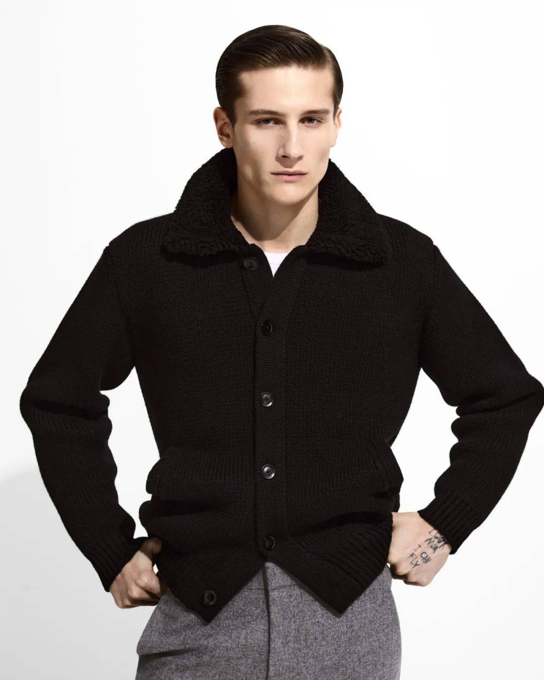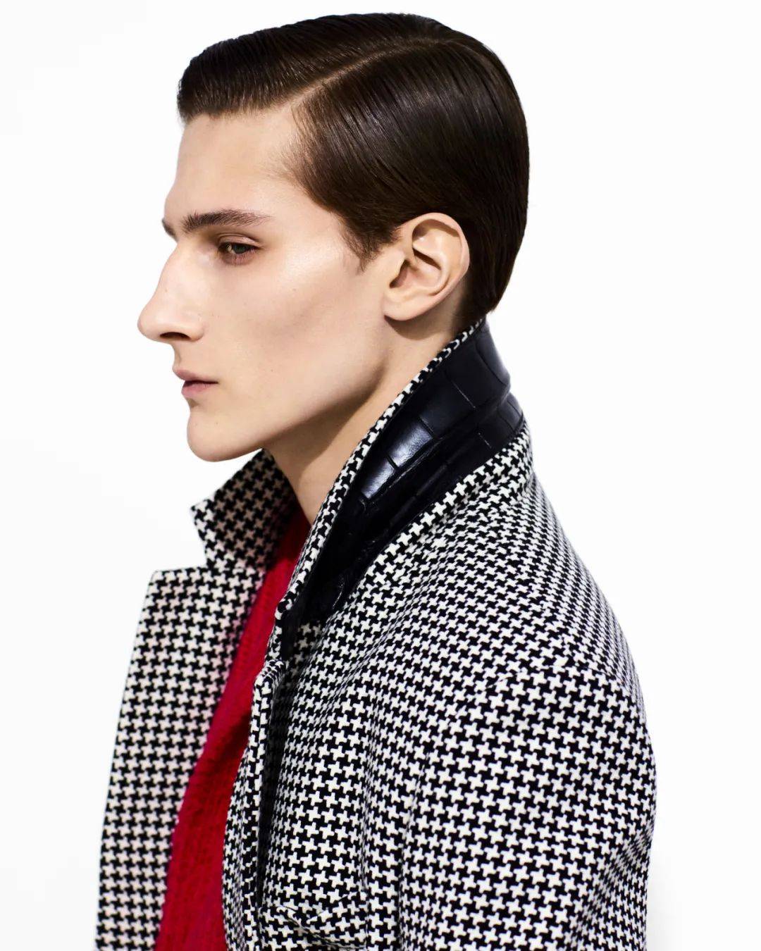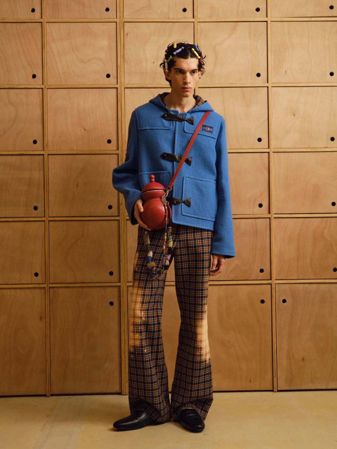 男装以双排扣戗驳领西装开启华章。经典机车夹克以oversize廓形重塑,内衬同色剪羊毛彰显质感,与1950年代复古牛仔裤相得益彰;粗花呢都市大衣以巨型千鸟格纹释放不羁气韵。