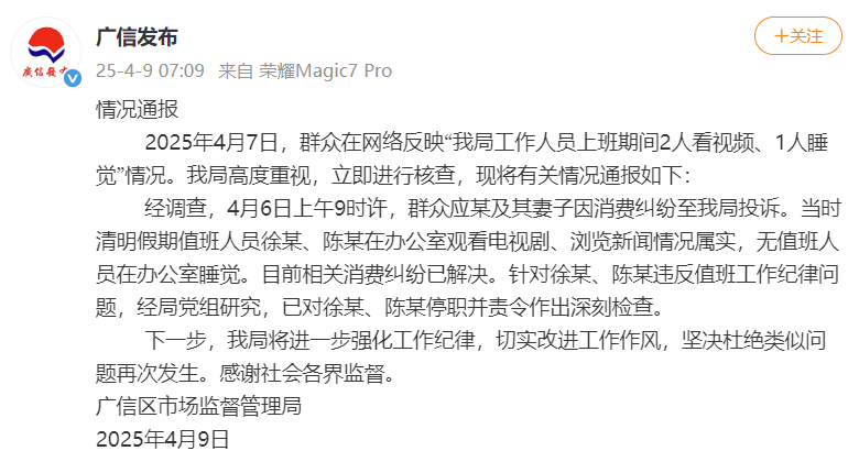 2025年4月7日,群众在网络反映该局“工作人员上班期间2人看视频、1人睡觉”情况。广信区市场监督管理局高度重视,立即进行核查。