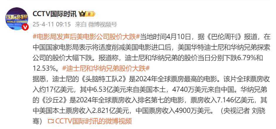 当地时间4月10日,据《巴伦周刊》报道,在中国国家电影局表示将适度削减美国电影进口后,美国华特迪士尼和华纳兄弟探索公司的股价大幅下跌。报道称,迪士尼和华纳兄弟的股价当日分别下跌6.79%和12.53%。