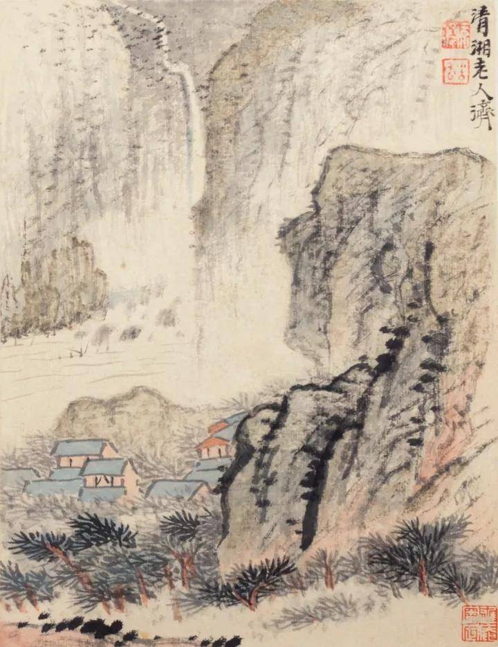 石涛《细笔山水册》,创作于康熙四十一年,是年石涛61岁,定居扬州,专心画事,成熟时期的独特面貌一览无余:以渴笔写景,或仰取山势,或俯摭江河,或写竹里高城,或写陡壁泉瀑,或作秋涧暮霭,或作歇雨山村。尺幅虽小而气象阔远。笔墨枯而腴,淡而厚,堪为格韵俱佳之作。