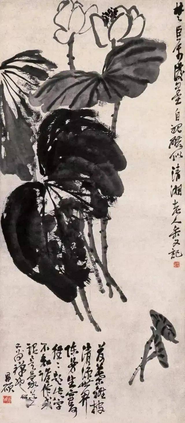 荷花荷叶墨汁涂,雨大不知香有无。频年弄笔作狡狯……青藤白阳呼不起,谁真好手谁野狐。——荷花寄井南