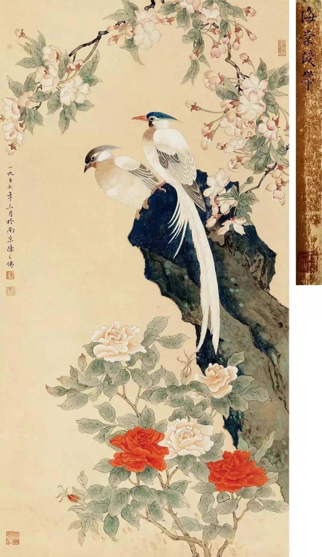 设色,是花鸟画的重要环节,花鸟画必借色而益彰。色彩运用是极微妙的,但是 " 随类敷彩 " 绝不是依样葫芦,要妙起自然才能进于 " 神似 " 的境地。同是青、红、黄、绿,运用得当如否,相差就很悬殊。