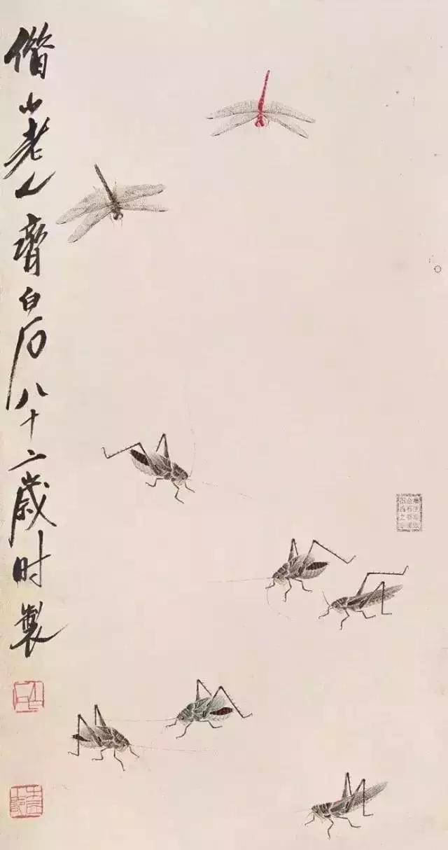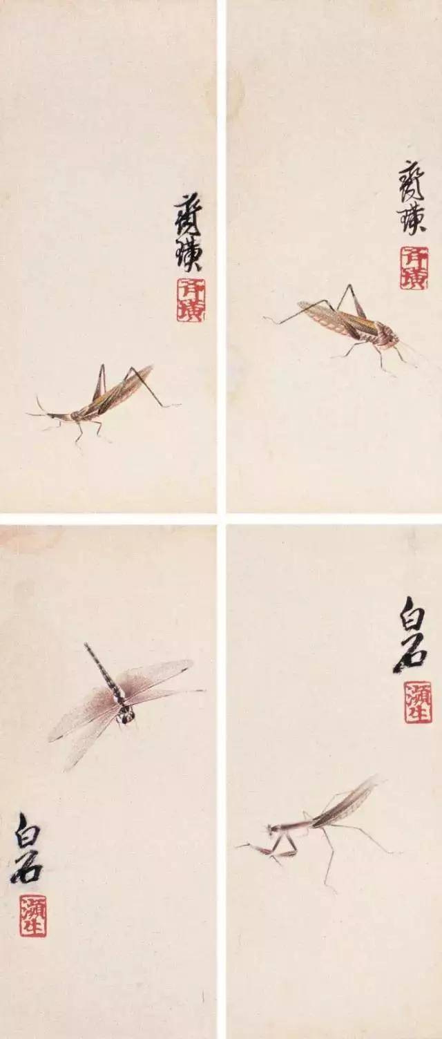 齐白石一生画的草虫品种非常丰富,多达数十种。不仅有蜻蜓、蝴蝶、蝉、蜜蜂、蝈蝈、蚂蚱、螳螂、蟋蟀、天牛、蛾、蝼蛄、蝗虫、灶马、蜘蛛、水蝽,甚至还有蟑螂和苍蝇。