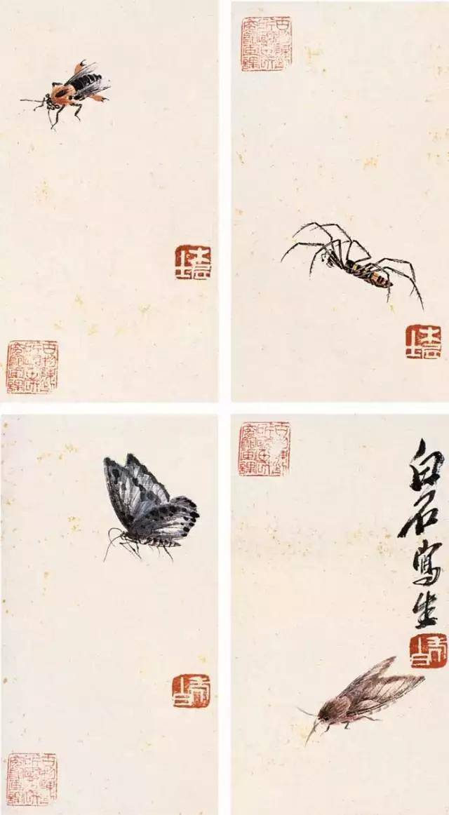 齐白石曾说,画虫“既要工,又要写,最难把握”,又说:“凡画虫,工而不似乃荒谬匠家之作,不工而似,名手作也。”齐白石画虫绝非凭空想象,而是来自于他自己亲眼所见。