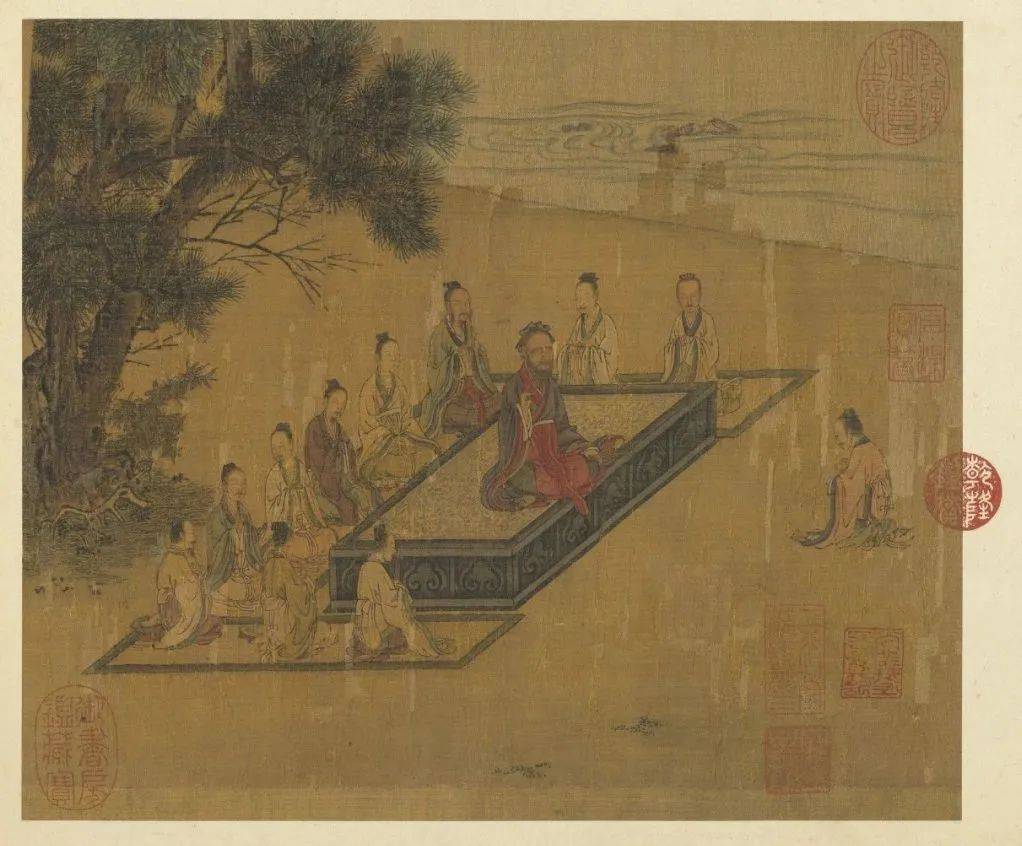 从明代仇英《摹宋人村童闹学图》可以看到宋代学堂的热闹景象。画中,一个半秃的私塾先生在睡午觉,东坡巾已被偷走。青衣小孩拿着毛笔回头,旁边坐着红衣小孩。虽然他写了几个“上大人孔乙己”,但明显身在曹营心在汉。左边的小孩持书追赶同伴,中间的小孩躺在桌上,像杂技演员一样蹬着凳子。右边的小孩正顶着书做鬼脸。紫衣小孩蹲在地上,给打瞌睡的老师画像。另一个小孩画了胡子,顶着茶壶,披着草书的长卷,拿着戒尺当笏板,装模作样地把老师当成皇帝来拜。可怜这位私塾先生正酣然入睡,却不知学生们正在大闹天宫。