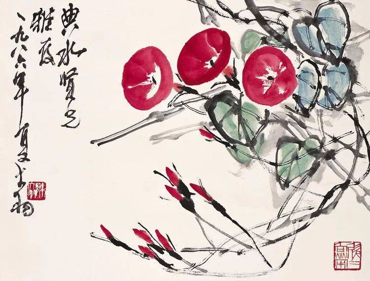 他对大写意花鸟最大的贡献,是一改传统写意文人画温文儒雅的气质,而代之以豪放的个性风格和雄强的时代特征。