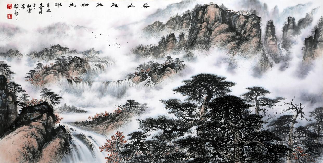 罗树辉先生作画气势雄浑,气场宏大。他尤其喜欢画大画,作品常常是满纸云烟,云蒸霞蔚,山高林密,松风扑面。罗树辉的松和山水画既秉承了他的老师黎雄才大师大气深邃、雄壮秀丽的风格外,还融入了个人的特点,把云霞烟雾画得飘忽缭绕,动静相宜,变幻莫测。八尺或丈二纸的大画,不消时日,一气呵成,挥洒而就。观其现场作画的运笔,颇有横扫千军,纵横捭阖的气势,又有春风吹拂杨柳,月下踏歌起舞的韵律,常常令观者忍不住拍手叫好。