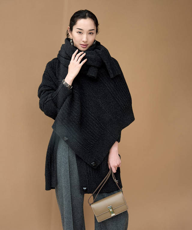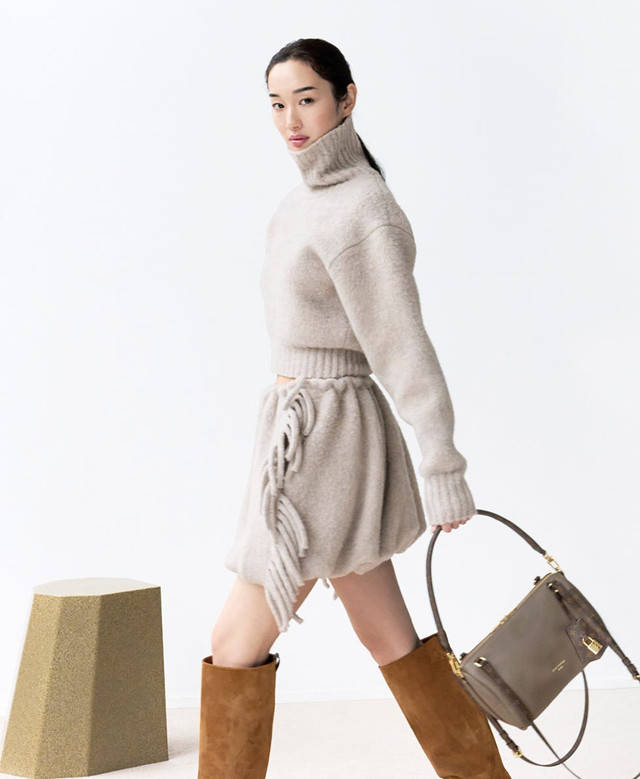 本季针织款式更丰富,推荐蓬松柔软的长毛绒或宽松粗棒针织。搭配自由度提升,采用独特的叠穿方式呈现。这些单品介于服装与配饰之间,可在毛衣或开衫外披上针织斗篷,或将毛衣如披肩般缠绕,通过统一色调与质感打造别致造型。
