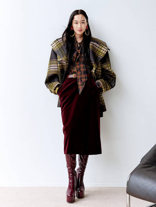 浓郁深邃的暗棕色成为与黑色、灰色并列的基调色,勃艮第红和梅子色等红调棕色流行,沉稳中透出高雅。通过同色系不同纹理与深浅的叠穿,展现丰富层次感。与英伦格纹搭配更显知性,悄然注入成熟风韵。