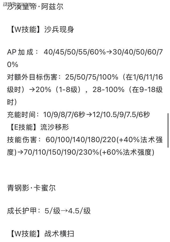 随着比赛的临近,25.20版本的正式更新细节也公布了,两个传统法师受到了极大的削弱,首先是发条,W技能伤害前期等级递减满级之后,直接少了50点,虽然增加了10%的法强加成,但整体的对线期可能会很难打。紧接着就是大家非常熟悉的中单沙皇w技能的AP加成全等级降了10%,对目标的额外伤害前期也降了将近50%,充能时间前期直接增加了两秒,E技能的伤害有所提升,全等级加了10点基础伤害和20%的法强。打野猴子的额外攻击力加成,也受到了很大的削弱。